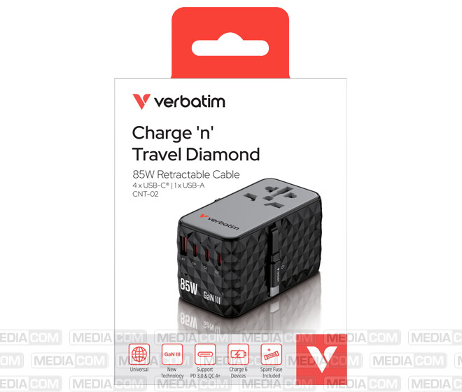 Ladeadapter, Charge'n'Travel, GaN III, 85W, USB-C Kabel integriert 1x USB-A QC, 4x USB-C PD, 100-250V, Retail