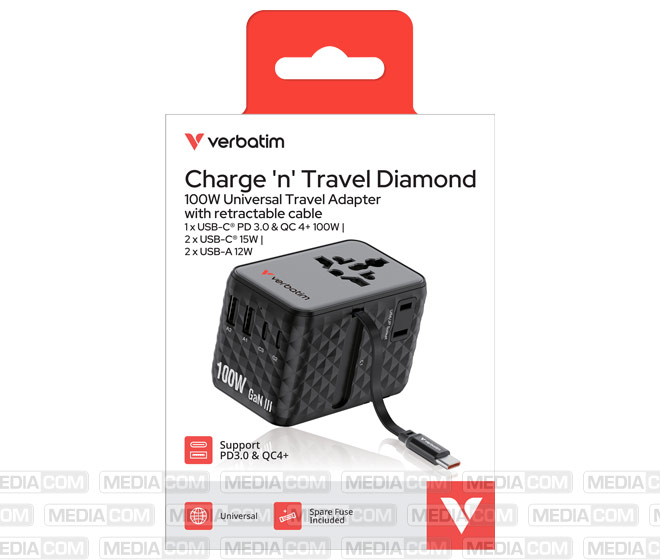 Ladeadapter, Charge'n'Travel, GaN III, 100W, USB-C Kabel integriert 2x USB-A QC, 3x USB-C (PD), 100-250V, Retail