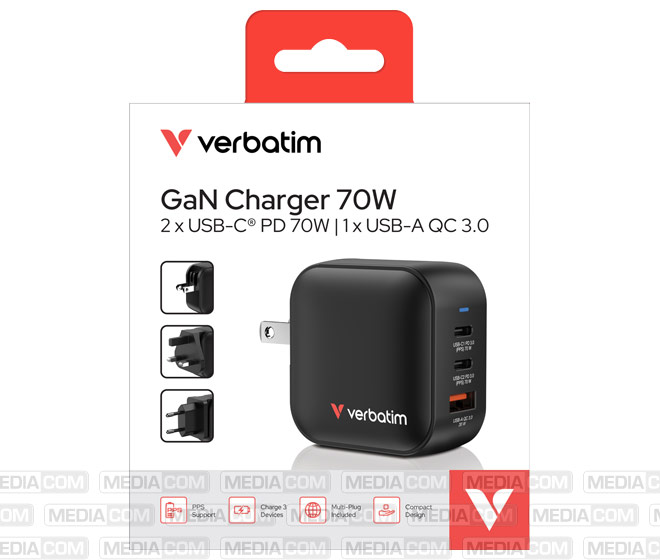 Ladeadapter, Mini GaN, 70W, schwarz 1x USB-A QC, 2x USB-C PD, Retail